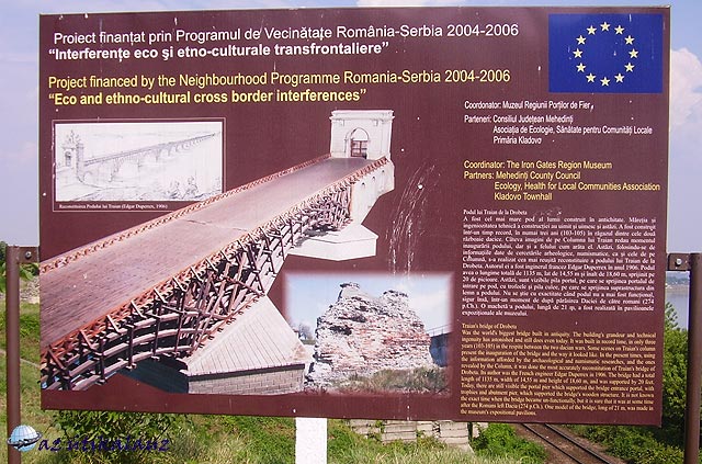 A hidat, miután a légiók oda-vissza masíroztak rajta, maga Trajanus romboltatta le. Legújabban a híd rekonstrukcióját vették tervbe, EU támogatással. Délután dacára nagy volt a hőség. A Kárpátoktól délre erősen érvényesül a mediterrán hatás. Minden szárazra aszott, a szél vidáman görgette a szemetet mindenütt. A város a központját igyekszik virágosan és tisztán tartani, nem sok sikerrel. A legfurcsább épületek kerültek egymás mellé, kételkedem, hogy várostervezés, vagy városrendezés létezik-e egyáltalán. Pénzváltó helyet azonban találtunk, hogy kellő mennyiségű sörre, borra és kávéra valót szerezzünk. Visszafelé hiába álltunk meg az erőműnél, hiába voltunk még a nyitvatartási időn belül, nem nézhettük meg – holott létezik a turisták számára program. Minden lakatra zárva, sehol teremtett lélek, aki bebocsátana, de legalább tájékoztatást adna. A fegyveres katonák csak azt várták, hogy mielőbb tisztuljunk onnét. Még a közelében sem szabad fényképezni. A völgyzáró gáton híd vezet Szerbiába, határátkelőhely. Itt még élnek a régi reflexek.