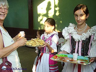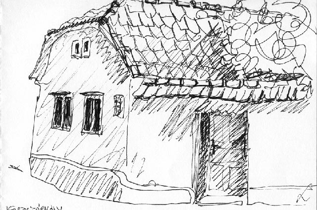 Ránk esteledett, mire befutottunk Köröstárkányba. A hosszú út után elgémberedve kászálódtunk le a buszról. Már várak bennünket: betereltek egy hatalmas kapun. Köröstárkányi viseletbe öltözött kislányok pogácsával és pálinkával kedveskedtek. Így már könnyebb volt a várakozás. A szőlővel befuttatott árnyas udvarban padokra ültettek és kényelmes tempóban elosztották a busznyi tömeget a vendéglátók között. Fiatal asszonyka kapta fel a csomagjainkat, és terelt egy autóhoz: kétutcányi távolságot is autóval tettünk meg. Vendéglátónk, Erzsike házán is óriási kapu terpeszkedett. Bádoglemezzel borítva, szögekkel kiverve, úgy ahogy az egész faluban. Bent sötét fedett kapualj húzódott, majd patyolat tiszta udvar, szőlőlugassal persze. Beljebb újabb nagykapu zárta le az udvart. Csak másnap reggel jöttünk rá, hogy ezen a patyolatos udvaron reggel ki- este besorol a tehén. Nemcsak az udvar, az istálló is elképzelhetetlenül tiszta. Pedig a tehén bizony gyártotta a lepényeket szorgalmasan. A gazda, vagy Erzsike azonnal ugrott, és tisztára sikálta a lepény helyét. Se a jellemző trágyaszag, se légy nem keserítette a ház lakóit. A tisztaság mindenütt megmutatkozott: egyik nap épp akkor értünk haza, amikor a gazda slaggal mosta a ház falát, hogy tiszt a legyen. Mint megtudtuk, minden héten lemossa!