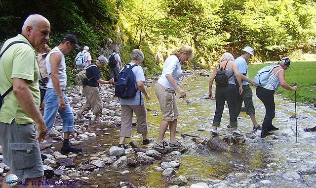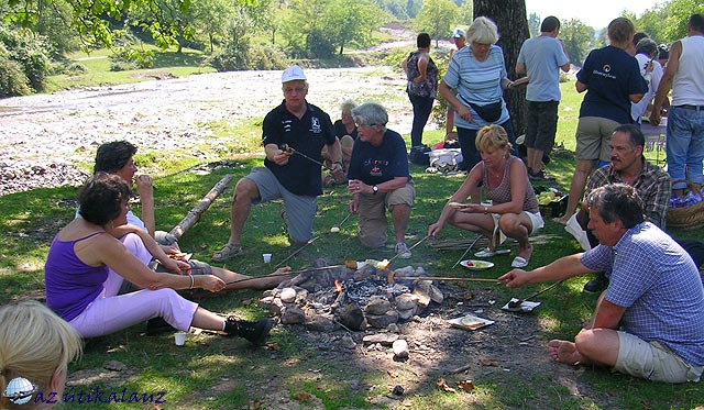 Jó félórát töltöttünk a barlang bejárásával, aztán újra le kellett ereszkedni a törmeléklejtőn – jó néhány nadrág feneke sínylette meg. Visszafelé az út már könnyebb volt. Gátlás nélkül léptünk bele a patakba az átkeléseknél. Már úgyis vizes volt a cipőnk kívül-belül, minek kényeskedni? Ahogy közeledtünk a tisztáshoz, mennyei illatok szállingóztak felénk. Vendéglátóink a tisztáson maradt társainkkal együtt tüzet raktak és szalonnát sütöttek. Éhesen vetettük magunkat a friss házikenyérre, szalonnára (sütés nélkül is nagyon finom volt), a felszeletelt paprikára, paradicsomra. Kibújtunk a vizes cipőkből, kiraktuk száradni a patakpartra, és neki láttunk mi is a szalonnasütésnek. Jót nevettünk, amikor egyik társunk szomjasan meghúzta az ásványvizes üveget, elkékülve köhögési rohamot kapott: szilvapálinka volt benne?