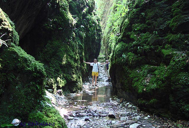 Ahogy haladtunk felfelé a völgyben, egyre kevesebb víz volt a patakban, egyre szűkebb lett a völgy. Egy jó órai patakmenet után elértük a Schmidl Kőközt. Itt már annyira szűk a szurdok, hogy két kezünkkel megérinthetjük a sziklafalakat. A nedvességtől vastag moha fed mindent. A fény kevés, nehéz volt fényképezni. Mind a négy végtagunkra szükségünk volt, hogy a sziklákon, bezuhant fatörzseken átmásszunk. Aztán egyszerre csak lehetetlenné vált a továbbjutást. Most már előttünk is meredek sziklafal, azon csordogál a patak. Valahol magasan a fejünk felett zsebkendőnyi kék eget látunk. Itt vissza kellett fordulnunk, de újabb élvezet még egyszer végigjárni a kőközt.