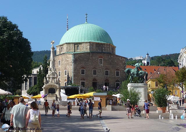 Pécs – a Széchenyi tér a Jakováli Hasszán-dzsámival és Hunyadi János szobrával