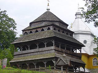 Jaszeniaja Zamkovában is gyönyörű fatemplomot találtunk. Nem is egyet, azonnal kettőt: 1730-ból való, négyzet alapú templom, háromszintes, az egyes szinteken körbefutó fa-loggiákkal. Maga a templom az első emeleten van. Mellette áll a száz évvel fiatalabb templom, amelyet ma használnak. A templomokhoz felvezető kapu is gyönyörűen faragott.