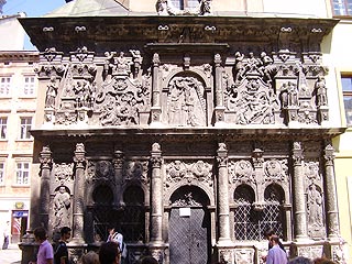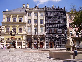 Innen pár perc a Rinok, de előbb át kellett vergődni egy hatalmas bolhapiacon. A Rinok közepén hatalmas, klasszicista városháza trónol, a négy sarkán négy kút, négy görög istennel. A teret körülvevő házak reneszánsz részleteket őriznek. A keleti oldalon szépen tatarozott reneszánsz homlokzatú palotácskák sorakoznak. A fekete Anczeski-házban a Lembergi Történeti Múzeum található (belépő 4 hrivnya). Az első emeleti faragott ajtó és ablakkeretek ellensúlyozzák a többi emelet fényképeit sok-sok ukrán szöveggel. Mellette áll a Sobiesky-palota vagy Korniakt-ház (belépő 4 hrivnya), szép reneszánsz udvarral (újabb 0,5 hr).