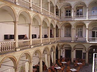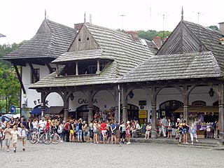 A lábas házak árkádjai alatt lehet sétálni a napsütés elől elbújva. Csodás kapuk, nincs két egyforma. Remek üzletek, kávézók, cukrászdák. Egy kávé 5 zl, egy korsó Zywjecz 5 zl, pohárral 4 zl. A főtéren vacsoráztunk speciális lengyel ételeket: zurek staropolskit, pelmenit. Az árak hasonlók, mint Lembergben.