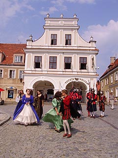 Elbúcsúztunk a barátságos falusias idilltől és délnek indultunk. Sandomierz volt az első megállónk. Közvetlen a Brama Opatowska alatt sikerült parkoló helyet találni. Onnan csak gyalog lehet sétálni az óvárosban. A városka rendezett, tiszta. Amint a Rynekre értünk, zene szólalt meg, reneszánsz ruhás lányok és fiúk menetét pillantottuk meg, akik körbe járták a teret. Ezt óránként megismételték.