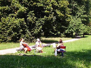 Dühösen ugyan – de mit tehettünk mást – körbe sétáltuk a parkot, megnéztük a kocsimúzeumot. Az egyik melléképületben zeneiskola működik, központja a nyári nemzetközi zenei heteknek. Az ablakokból szólt a muzsika, a nagy parkban az árnyas fák alatt gyakoroltak a fiatalok.