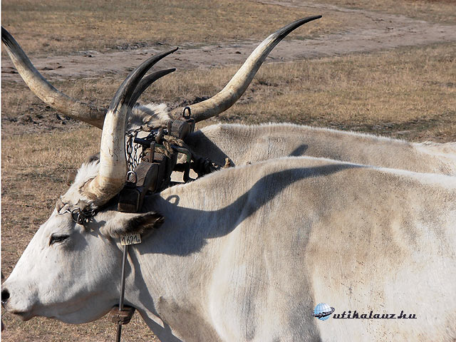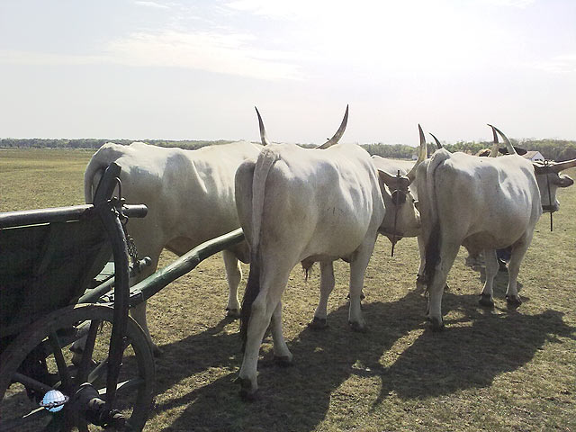 A pusztai lovasok után jött a szürke szarvasmarha gulya. Férjem olvasott valahol egy ostoba cikket, miszerint a szürke marhát túlértékelik, node könyörgöm! Magyarok vagyunk, ez őshonos állat nálunk, törvényeink védik, s húsa is oltalom alatt álló földrajzi jelzéssel ellátott. Olyan ez, mint a Szögedi Paprika és a Tokaji Aszú. Legyünk már kicsit büszkék a magyarságunkra, hagyományainkra és a hungarikumokra! Egyébként szürke marhákat ma már inkább látványosságként tartják, s a csorda nagy része herélt bika, azaz tinó. Ha a tinók hosszas trenírozás folytán megtanulják a szekérhúzást, ökör lesz belőlük. Nohát, ezért kell tanulniuk!