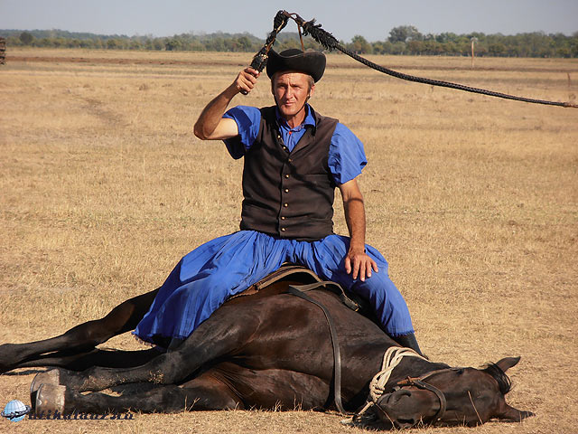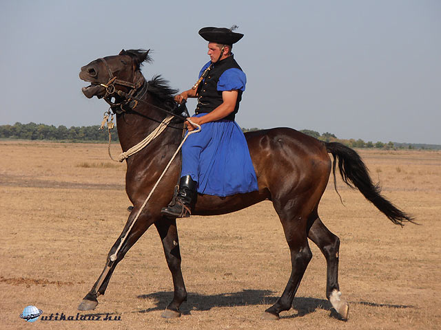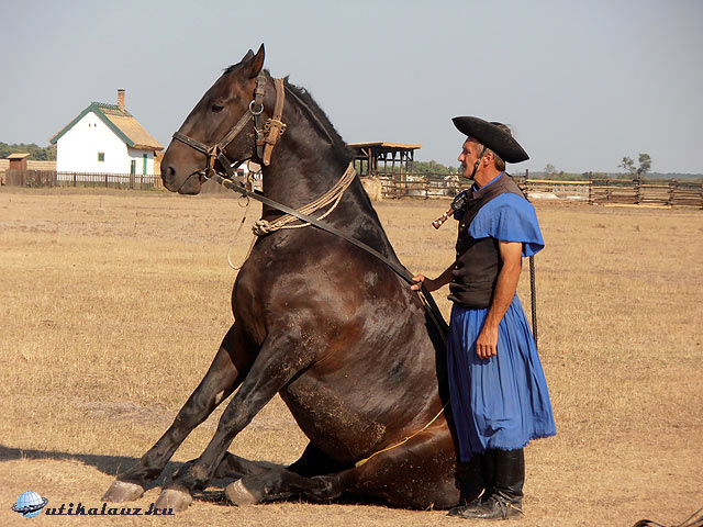 A következő megállónk a pusztai lovasoknál volt, ahol a három lovas kékszínű egyenszerelésben trenírozta lovát. Előbb ostorcsattogtatást hallottunk, majd a lovak lefeküdtek, végül felültek. Mulatságos látvány volt, főleg, hogy az egyik ló nem is nagyon akarta az igazságot. A lovak gyönyörűek, erősek, tiszták, ápoltak voltak, látszott, hogy sokat foglalkoznak velük.
