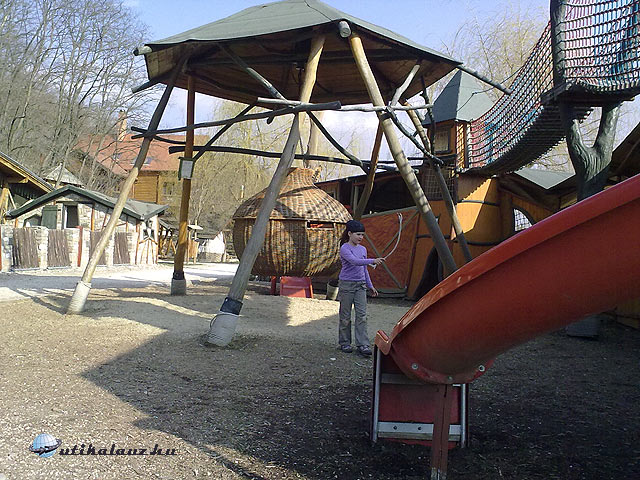 Az állatsimogató után jól esett kicsit leülni a fából készült nagy padokra, ahol két játszótér is várta a gyerekeket. Az egyiken egy kalandvár és egy nagy vesszőből készült gömbhinta, másikon csúszdák, körhinta és egyéb fából készült játék biztosított számunkra egy kis pihenésnyi időt. Persze nem sokáig, mert a körhinta nagy, nehéz, és emberi meghajtású. Az 5-6 faló folyamatosan foglalt volt, minden gyerek ki akarta próbálni, a szülők pedig nem győzték tekerni a kormányt.