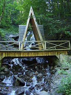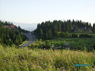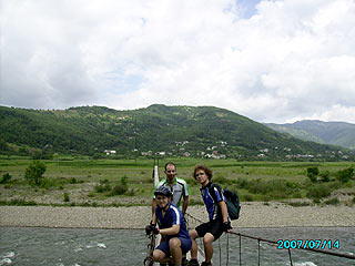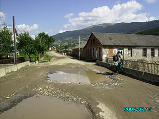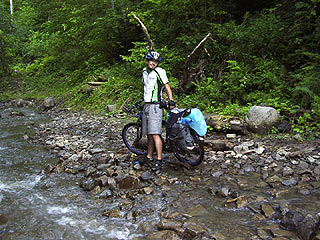 Elfordultunk egy kereszteződésnél balra, ott, ahol egy fára szögelt KRESZ-tábla a főút kanyarodását jobbra jelöli. Ezt a szakaszt a falun belül főútként jelölte a térkép. A valóságban traktorral is nehéz lehet végigmenni, ugyanis az út földút, tiszta kátyú, gödör és tele van óriási kövekkel. Na mindegy, mi azért tekertünk – arra kellett egyedül vigyázni, hogy ne kapjunk defektet. A falut elhagyva csak tovább romlott a helyzet, ugyanis olyan meredek szakasz következett, hogy 300 métert kb. fél óra alatt sikerült leküzdeni – természetesen tolva (a térképen ez a szakasz is járható útként van jelölve). Láttunk állatnyomokat is: teheneket, kutyákat, talán egy medvenyomot is, meg még valamit, de arra nem jöttünk rá. Felértünk a tetőre. Nagyon szép volt a naplemente ezen az elhagyatott vidéken, azonban nem itt akartunk sátrat verni, úgyhogy folytattuk az utat. Találkoztunk kerékpárosokkal is! Tőlük megtudtuk, hogy hasonló lesz az út további része is. Így is lett. Hatalmas lejtőn jöttünk le, megint csak tolva, mert akkora kövek voltak, majd egyszer csak eltűnt az út. Maradt a patak medre. Legalább hüsöltünk egyet, bár kb. 3 km-t tettünk meg térdig-bokáig érő vízben, úgyhogy a végére nagyon meguntuk az off-road-ot (persze a biciklistáskák is beáztak).