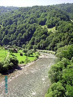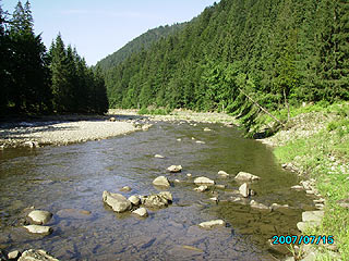 A meleg csak fokozódott, 36 fok árnyékban volt, ezért Barnabás falucskában megálltunk egy boltnál. Untuk már a felvágottféléket, ezért lekvárt vettünk, almásat, egész olcsón, ráadásul finom is volt (láttunk hagymás-uborkás változatot is, de ahhoz nem voltunk elég bátrak). Itt kaptam vissza gyufában a visszajárót. Folytattuk utunkat Rahó felé, amit kora délután értünk el. Rahó szerintem nagyon szép városka, a város lakosságának tizede ráadásul magyar (beszéltünk is velük – a piacot kerestük). Némi pihenő után viszont továbbindultunk, mert minden pont zárva volt (ebédszünet), több idő pedig nem maradt. A Fekete-Tiszát követtük, gyakran álltunk meg fényképezni, hiszen nagyon szép tájakon jártunk. Megnéztük Kárpátalja legnagyobb vízesését a Trufanec vízesést is, nagyon szép volt és jó hűvös. Kora este voltunk Kőrösmezőn. Ez a városka nekem kevésbé tetszett, de azért kellemes volt. Innen vitt az út a Fekete-Tisza forrásához, de sajnos már kihagytuk. Plusz egy nap lett volna, amihez már nem volt kedvünk – megint van miért visszajönni. Egy 5-6 km-es emelkedő után Kárpátalja keleti határán, a Tatár-hágón voltunk, ahol a szállást is terveztük. A hágóval szemben volt egy domb, oda tekertünk fel. Jó sátorhely volt, senki nem zavart minket. Ma 70 km-t mentünk, de szinte végig emelkedett