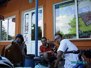 A sátorozásról ma este végképp lemondtunk, ezért mindenképp szerettünk volna valami olcsó szállást találni (az út mellett patkányok is visítoztak!!); ezt valahol Oroszmokra végén meg is találtuk. Könnyű volt felismerni, mert egyedül itt volt közvilágítás a ház előtt. Olcsónak viszont nem volt az: fejenként 12 dollárt (vagy 60 hrivnyát) kértek, de nem volt más választásunk. Ma este végre megint zuhanyoztunk! Isteni volt! Nem tudom pontosan, de kb. 50-60 km-t tehettünk meg.