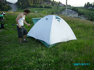 A táborbontás kicsit későn, 10 óra után ért véget, ezért már a legnagyobb melegben indultunk. Az első útba eső faluban, Herincsében bevásároltunk: valami bizonytalan kinézetű felvágottat, kenyeret és nagyon finom, 4 hrivnyás „Roshen” csokit (azt hiszem, ez a márkája), na és pesze ásványvizet. Itt tapasztaltuk először azt, hogy a visszajárót – kisebb összeget – cukorkában kapjuk; na persze nem volt baj. Ökörmező még 40 km-re volt, az út addig hol emelkedett, hol lejtett. Útközben vettünk egy palack házi bort, ami iszonyú savanyú volt, és megálltunk ebédelni egy útszéli saslikárusnál, ahol hárman 35 hrivnyáért kajáltunk. Ökörmező előtt fél órával kapott el minket a zivatar, de szerencsére nem volt olyan „áztató” mint a tegnapi. Ökörmezőn áthaladva Szinevér felé fordultunk, ami egy hegyi út volt. Nemsokára jó hosszú, alattomos emelkedő kezdődött, kb. 6 – 8 km hosszan; a vége felé egész eldurvult. Megérte a fáradozást, mert a dombtetőn elértük a Szinevéri Nemzeti Park határát és csodálatos volt a naplemente is. Ha emelkedett, szerencsére lejtett is: átlagosan 60 km/órával száguldottunk be Alszószinevérre. A faluban szállás csak egy lepukkant munkásszállásra emlékeztető házban akadt irreálisan drága 45 hrivnya/fő áron, ezért a vadkemping mellett döntöttünk a nemzeti parkon belül – nem tudom mennyire szabályos (nyilván semennyire), de ez van, nem szóltak miatta. A sátrat a falutól pár km-re a Talabor melett vertük fel. Ma nem mentünk sokat, kb. 70 km-t, de nem is terveztünk többet, mivel végig emelkedett az út. Ismét jól eltelt az éjszaka. Szerencsére észrevettünk néhány bunkert az Árpád-vonal megmaradt tagjai közül; egyikbe bele is mentünk.