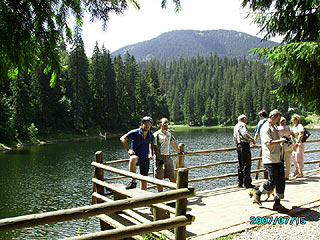 a Szinevéri-tavat. Ha már itt voltunk semmiképp sem akartuk kihagyni, ezért elindultunk a tó irányába – jól döntöttünk. Egyszer már láttam a tavat, októberben, most napsütésben még szebbnek tűnt. Útközben kétszer fizettettek velünk 2 hrivnyát fejenként (autósóknak azt hiszem ez 6 hrivnya), a tóhoz pedig egy nagyon meredek út vezetett fel. Sok magyarral is találkoztunk, ami jó érzés volt. Némi pihenő után folytattuk a túrát. Szerencsére az út végig lejtett egészen Alsókalocsa faluig, így ez nem volt megerőltető szakasz. Na de ami ezután következett…