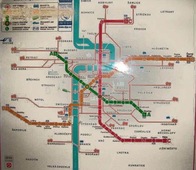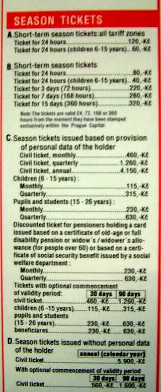 Prága teljesen rendezett tömegközlekedéssel jellemezhető. 3 metró vonala behálózza a teljes város területet a külvárost is beleértve. Villamos járatainak se szeri se száma és a belváros szinte minden autóval járható utcájában közlekednek. A járatok száma sokszorosa a Budapesten megszokottnak, szinte mindig érkezik a megállóba egy villamos. A jegyeket automatából, trafikból, metró megállóban is meg tudod vásárolni. AJÁNLOM, hogy megtedd, mert 4 járatból 2-szor találkoztunk ellenőrrel. Ismerve a jegyárakat és felhasználhatóságukat én ezt a rendszerességet rendben is találtam. A jegyeket ugyanis nem a járatokhoz, hanem az eltelt időhöz kötik. Egy 20,-CZK (180,-HUF) jegy 90 percig szabadon felhasználható a különféle járatokon (a további jegyárak a fényképen)! AJÁNLOM ezt a Budapesti Közlekedési Vállalat figyelmébe, ez javítaná a közlekedési és a fizetési morált!!! Minden fontos tudnivaló angolul is megtalálható, így nem volt szükségünk kérdezősködésre!