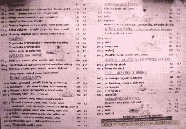 Nos csalódni fog, aki azt hiszi, bárhova bemegy és jóllakik kis pénzből. Nekünk segítségünk volt a legolcsóbb, de bőséges étkezés biztosításához. Azt ajánlom a szállodában jól reggelizzetek be (nem kell szívbajosnak lenni a tányérok megpakolásánál) és az kitart du.: 2-3 óráig. Akkor pedig ezt a helyet ajánlom, mi 500,-CZK (4.500,-HUF) ebédeltünk meg 4 főre sörrel, üdítővel, teával. A helység nem fényes, a pókhálós világítótesteket csak az “ezer” éves falfestés íbereli, de tisztaság van az asztalon és környezetében. Az étel kitűnő és bőségesen elegendő, a sör jó! (Hát… ha még ez sem reklám?! Ne tovább!!! – a szerkesztő.:)
