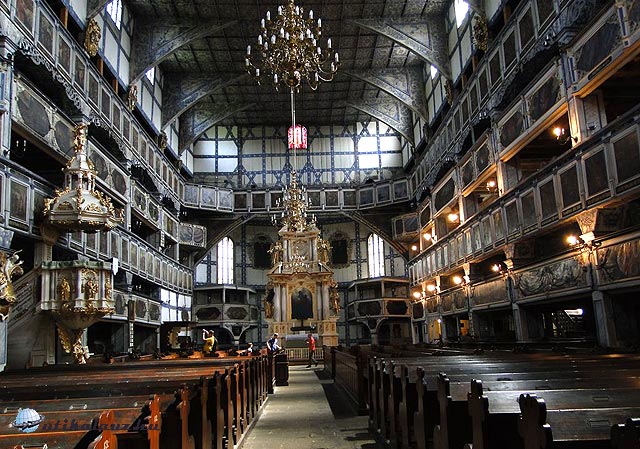 Kis túránk végeztével Jawor településre indultunk, itt található az a Világörökség részét képező gerendavázas evangélikus fa béketemplom (a neve arra utal, hogy a westfáliai béke után emelték), melyhez hasonló sehol sincs a világon. A városban mindenütt ki van táblázva, azonban mégsem sikerült elsőre megtalálni, mert fák között bújik meg, és kívülről egy egyszerű fagerendás templomnak tűnik, de a belseje valóban különleges. Gazdag barokk díszítése a gyönyörű festett karzatokban nyilvánul meg, belső elrendezését egy többszintes színházhoz tudnám hasonlítani. A belépődíj 8 PLN, a jegyárusítót meg lehet kérni, hogy kapcsolja be az angol vagy a német nyelvű (hangszóróból szóló) tájékoztatót.