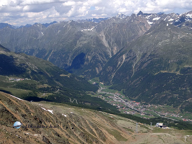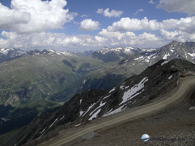 Délután a már emlegetett magas hegyek meghódítására került sor, a kényelem jegyében természetesen drótkötélpályás felvonóval. Söldent többek között azért is választottam bázisul, mert több felvonó is a turisták rendelkezésére áll, mi – idő hiányában – csak az egyiket, a legmagasabb hegyet legegyszerűbben elérő Gaislachkoglbahnt tudtuk igénybe venni. A felvonó első szakaszán a kabin 1363 méteres tengerszint feletti magasságból indul és a közbenső állomásig, az ún. Mittelstation-ig 2174 méterig visz. A kabinok kényelmesek, tágasak, és mivel folyamatosan és sűrűn követik egymást, így nem kell másokkal összezsúfolódva végigkínlódni az utazást. A második szakasz az elsőhöz hasonló kényelemben 3040 méterig szállítja az utasokat, egészen a Gaislachkogl (és odafönt úgy éreztem: a világ) tetejéig. A csúcson egyik ámulatból a másikba estünk, az első benyomásunkat azonban az elkeseredettség és a harag vezérelte, ugyanis egy építkezés kellős közepébe csöppentünk. A csúcson ugyanis egyenlőre nincs semmilyen olyan létesítmény, ami a turisták komfortérzetét hivatott fokozni, így természetesen ide is építeni kell egyet. És persze éppen most, amikor mi járunk arra… A kiírás szerint 2013. decemberére el is fog készülni egy „csodás” étterem-komplexum. Mi ebből annyit érzékeltünk, hogy nagyon magasra utaztunk, nagyon sokat fizettünk érte (a menettérti jegy összesen 25 EUR/fő), ehhez képest nem a béke és a nyugalom, hanem a tolató teherautók folyamatos sípoló hangja, kordonok és rengeteg por fogadott. Az egészben az a vicces, hogy utazásaink során számos felvonót kipróbáltunk már, s így számos csúcsot „hódítottunk meg”, de emlékeim szerint sosem jártunk még olyan helyen, ahová ne lehetett volna autóval eljutni.