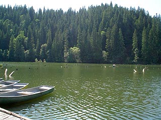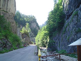 12,50-kor indultunk tovább a Békás-szoroshoz. A szoros közepéig busszal, onnan gyalogosan sétáltunk a hatalmas sziklák övezte úton, mellettünk a gyors folyású patakkal. Természetesen ott is folyik a kirakodóvásár. A busz átvitt bennünket a Gyilkos-tóhoz. Ott is egy fél órát töltöttünk. Lementünk a tópartra, ahol a fenyőcsonkok merednek ki a tó vizéből, az egykori természeti katasztrófa konzerválódott maradványaként.