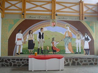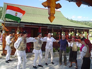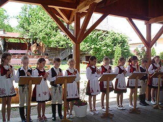 Délután 2-re visszaérkeztünk a panzióba. Beültünk a nyitott oldalú fagerendás helyiségbe a padokra. Itt kisiskolás lányok és fiúk népviseletbe öltözve adtak szívszorító, hangulatos műsort. Furulyáztak és magyar népdalokat énekeltek, de elhangzott a „Boldogasszony anyánk”, végül a székely himnusz, magyar himnusz következett. A gyerekek kaptak üdítőt, majd visszajöttek és népdalvetélkedőt tartottunk, egyet ők, egyet mi daloltunk. Nagy siker volt…