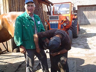Mi addig elmentünk az utcán a 3. házba, a patkolókovácshoz, végignéztük a lópatkolás tudományát. A Kati nevű lónak patkolták a patáját. Annak rendje és módja szerint egy segítő ember fogta a ló hátra nyújtott hátsó lábát, a patkolókovács pedig végezte a munkát. Először levette a régi patkót avasból készült szerszámaival, majd lereszelte a benőtt szarurészt és következett a patkó rátétele és a szögek beütése, behajlítása, a végén a szögvégek elkalapálása. Miközben a kovács dolgozott, a segítő magyarázta, mit miért és hogyan csinálja. Közben benéztünk a szinte múzeumba illő műhelybe, ahol régi eredeti szerszámok, kalapácsok, üllő, izzító kemence is volt a helyiségben, rengeteg patkó társaságában. A végén mi is kértünk egy már nem használható patkót emlékbe.