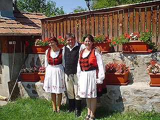 Innen továbbmentünk egy gyimesbükki panzióba, itt kezdődött a csángó program. A panziótulajdonos tanár úr fogadott bennünket a panzió udvarán, népviseletbe öltözött legények kínálták a köménypálinkát, majd ugyanők rázendítettek hangszereikkel (egyikük gordonnal – ez egy ütős bőgő – másikuk hegedűvel).