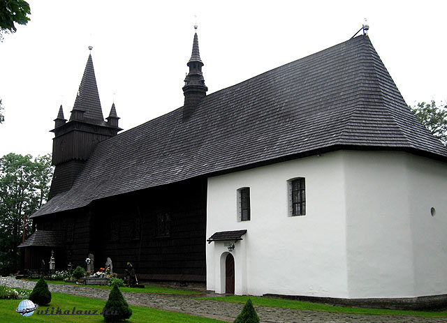A lengyel határnál szintén megálltunk, nem is keveset, 50 percet. Az útdíj elektronikus feltöltése miatt, még elég nehezen ment. Ezt a feltöltést később az úton levő kapuknál ellenőrizték. Több helyen útjavítás, illetve baleset miatt dugók akadályozták a gyorsabb haladást, már nem autópályán haladtunk. 17 órára érkeztünk első úti célunkhoz, az orawkai fatemplomhoz. A terület a történelmi Magyarország része volt. Az Árva folyó völgyében létesült templomot 1650-ben építették vörös fenyőből a helyi mesterek szög nélkül. Itt található a magyar szentek és boldogok legnagyobb templomi, népi festésű szentkép gyűjteménye. A templomot Szent János tiszteletére szentelték, egy hajós, gótikus stílusú. Az oltárkép mellett Szt. István, illetve Szt. László szobor áll, az oldalfalakon a magyar szentek (Szt. István, Szt. László, Szt. Imre herceg és mások) mellett lengyelek is. Kazettás mennyezet díszíti. A szentély mögött át lehetett menni az altemplomba, ott is orgona, oltár áll.