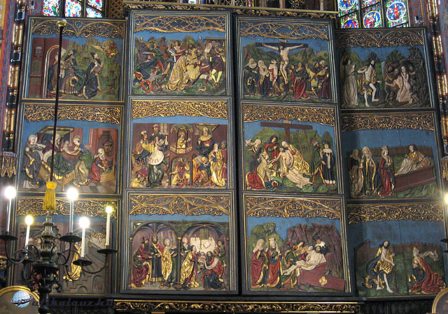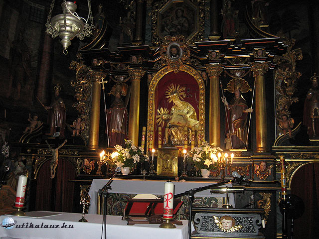 Volt kis időnk, így bementünk a templom imádkozásra szóló hátsó részébe, onnan csak messziről látszott az oltár, amely kordonnal van leválasztva. A megbeszélt időben csoportosan belépődíj ellenében egy oldalbejáraton mentünk be a szentély előtti díszes részbe, a nevezetes szárnyas oltár elé. Ez egy 11×13 méteres fafaragásos tábla. Becsukott állapotában Mária 12 gyötrelmét mutatja be. Nyitottan Mária örömteljes titkait, illetve fő témaként elszenderedését ábrázolja.