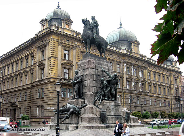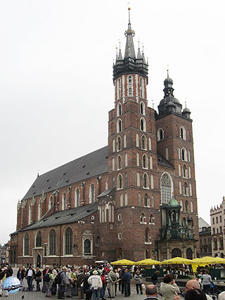 Egy utcán át elsétáltunk a Szt.Márk templomhoz. Ott az előtérben megnéztük a magyar-lengyel emléktáblát a II. világháború idején a lengyel menekültek magyarországi befogadása emlékeként. A táblán név szerint felsorolva id. Antall József, Teleki Pál és mások. Utána visszatértünk a főtérre a Mária Bazilikához. Két különböző magasságú (81 és 69 m) és kialakítású tornya van. Azért lett ilyen, mert egy egymással vetélkedő testvérpár építette. A templom oldalán Sobieski (a párkányi győztes hadvezér) domborműve áll.