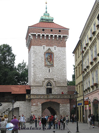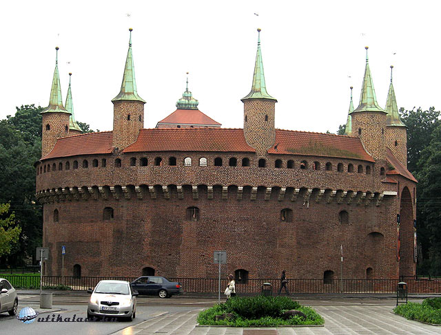 Megnéztük a Barbakánt és környékét. Mély árok veszi körül, sötétre égetett vöröstéglás zömök,  25 m átmérőjű, tornyocskákkal díszes építményét, amely a XV.sz-ban épült, impozáns része Krakkónak. Közelében áll a 21 m magas  Flórián kapu és a keretező várfal mellett festmények sokasága várja a turistákat.