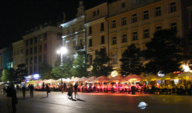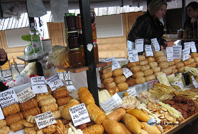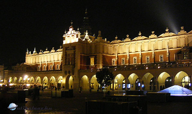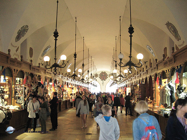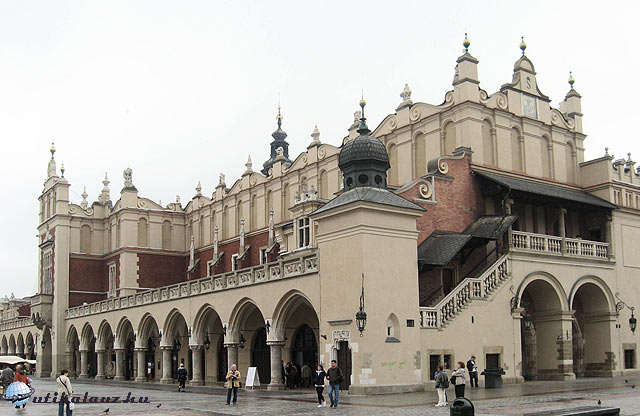 A felújított csarnokban egymás mellett álló rengeteg áruda, borostyán és egyéb ékszerek, szuvenír tárgyak árusításával. Sehol a téren nem találtunk egy kolbászsütőt, csak a mindenütt felbukkanó perecárusok kínálták portékájukat, kénytelenek voltunk azt venni 1,50 zl-ért. Csak kiülős vendéglátóhelyek vannak a nagy téren, arra viszont nem volt időnk. Nevezetes még a hatalmas Mickiewicz szobor is a csarnok előtt. Ott sorakoznak a díszes városnéző lovas hintók is.