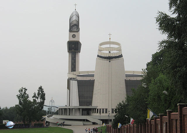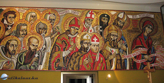 16 órakor buszra szálltunk és felkerestük a Sanktuarium épületegyüttesét, amelyet egy hajóra emlékeztető hatalmas, modern stílusú templom ural, messziről kiemelkedő toronnyal.(16) Bementünk a hatalmas belső terű, impozáns templomba, 2001-ben már állt, a szentélyben olvasható a pápa ajánlása ezzel a dátummal. Volt időnk leülni, csak 1 óra múlva tudtunk bemenni a Magyar szentek közössége kápolnájába. Az oldalfalakon magyar és lengyel szentek, személyiségek képei szerepelnek.