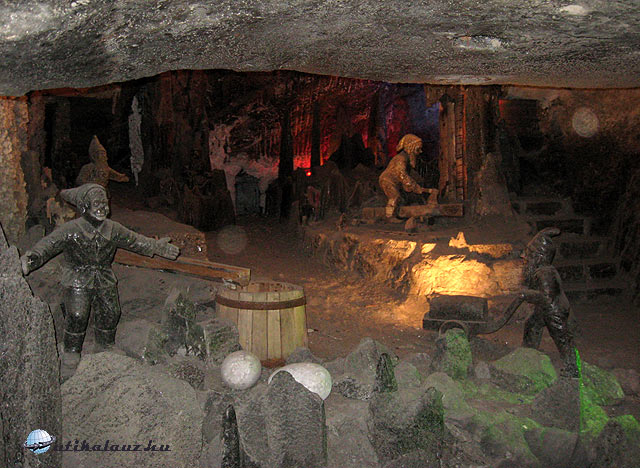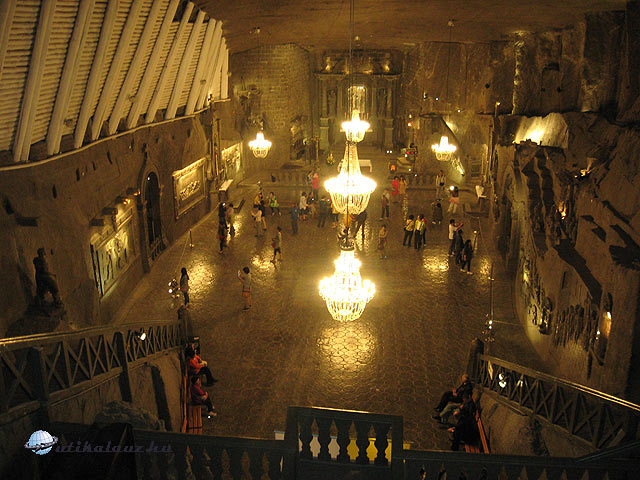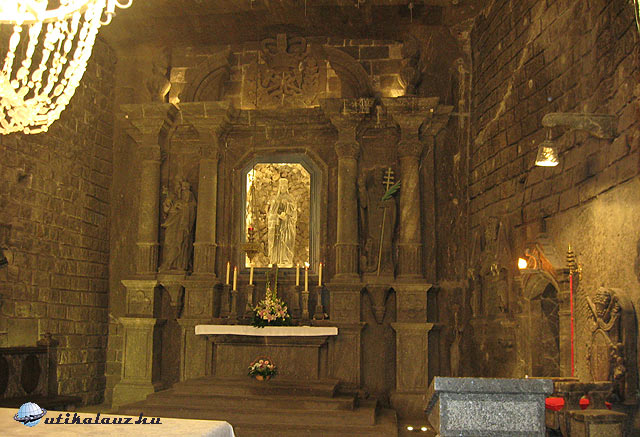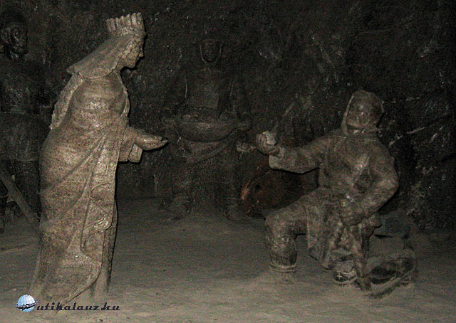 Reggel 8,15-kor indultunk a busszal Wieliczkára, a sóbányába. A 14 km-es út után beálltunk a parkolóba, onnan gyalog a múzeumként szolgáló sóbányához. 9,15-kor indult a csoportunk Tamara nevű kísérőnkkel, aki vezette a csapatunkat. Orosz nyelven ismertette a látnivalókat, a tanár úr magyarra fordította a szöveget, orosztanár lévén. Falépcsőkön mentünk le, számításunk szerint 52 fordulóval, 714 lépcsővel. Leérve a só vágatokban különböző alakzatok, sóból álló szobrok, bányászati eszközök, kiállítása, még bányalovak is. Mindjárt az elején a Szt.Kinga előtt térdelő Boleszláv királyfit örökítették meg a gyűrűje átadásakor, másutt Kopernikusz, Goethe, Sobieski és mások szobrai állnak. Lementünk a hatalmas kiterjedésű só katedrálisba, ahol oltár, Jézust és szenteket ábrázoló szobrok, domborművek láthatók, hatalmas csillár lóg középen.  A szentély előtt a társaságunk elénekelte a „Boldogasszony anyánk” éneket. A látogatás végén egy tavas részhez vezettek bennünket, világítási és zenés effektusokkal, Chopin zenére működött.  Egy tágas csarnokban még lent vendéglő és ajándékpavilonok üzemelnek. Némi várakozás után szabad utat kaptunk a liftekhez. 8-unkat tuszkoltak be 1-1 kabinba, örültünk, mikor felértünk a szabad levegőre… Fent is ajándékpavilonok állnak különböző sókristályokkal.