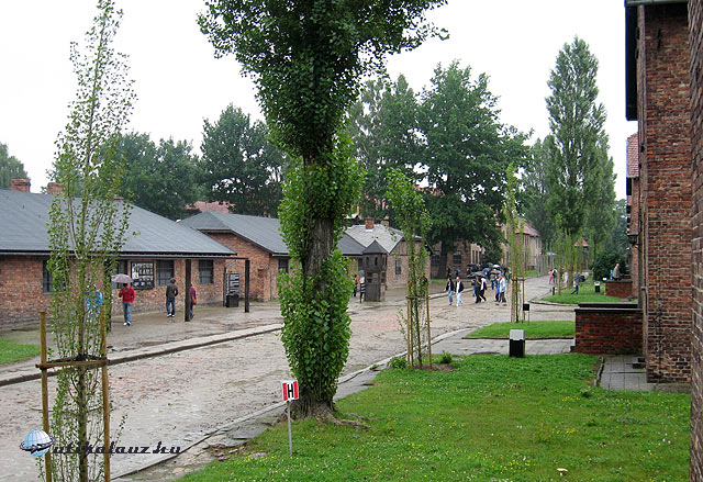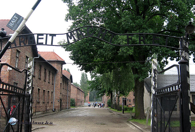 12,10-kor, még szép időben indultunk tovább, de már gyülekeztek a felhők. Következő  helyszínünk Auschwitz, az egykori haláltábor. Nagyon sok csoport kereste fel, de a kísérők mindent elrendeztek. 14,30-kor indultunk a nevezetes kapun át. Minket egy kint élő, magyar nyelven beszélő hölgy vezetett. Kaptunk egy-egy fejhallgatós készüléket, azon keresztül hallottuk kísérünk ott elmondott szavait. A sok csoport különben hangzavarba került volna. Végigjártuk a barakkokat, melyekben különféle tablók, berendezési tárgyak, priccsek, láthatók. Döbbenetes látni a halmokban álló szemüvegeket, cipőket, bőröndöket, levágott hajakat. A magyar barakkban magyar feliratú dokumentumok, tablók, használati eszközök, diaképek láthatók a Magyarországról elhurcoltakról. Végül egy gázkamrát mutattak be, a kettős szögesdrót kerítések közelében. Sajnos odaérkeztünk időpontjában el kezdett esni az eső és végig esett. A kültéren esernyővel kellett közlekedni kerülgetve a víztócsákat. Két helyen tilos volt a fényképezés: a hajaknál és a büntető celláknál, ahol Kolbe atyát is őrizték anno. A többi helyszínt vaku nélkül lehetett.