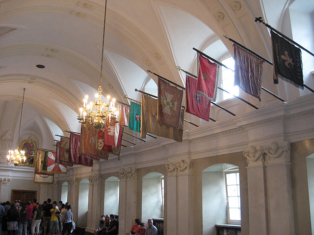 Ezután az uralkodók termébe kalauzolt bennünket az atya. Itt történelmi festménymásolatok borítják az oldalfalat, szemben egy feszület, mellette a kegykép másolata, balra a kolostor bejárati ajtaja. A kolostorba nők nem léphettek be, kivéve a királyi családot. Az egyik fali képen a csehek (husziták) támadása látható, a Madonna képet is tönkretették. (A kaszabolás nyomán két vágás nyoma látszik ma is a képen). A következőn a pálos kolostor látszik  a hegytetőn, a Mária kép segítségével a svédek támadása dőlt meg 1656-ban. A zászlókkal díszített terem másik végében a győzelem emlékére írt pátens szövege látható bronztáblán. A homlokzat felső részén két pompázatos tükör között fehér Mária szobor áll. A 12. számú fali képen a szentek sokasága jelenik meg, köztük a mártír Kolbe atya és Hedvig királyné is. Az atya ezután felkísért bennünket egy karzatra. 12 órakor volt az óránként ismétlődő ceremónia, a Mária képről kürtök hangjai kíséretében felemelkedik a borító aranylemez és láthatóvá válik a kegykép eredetije.