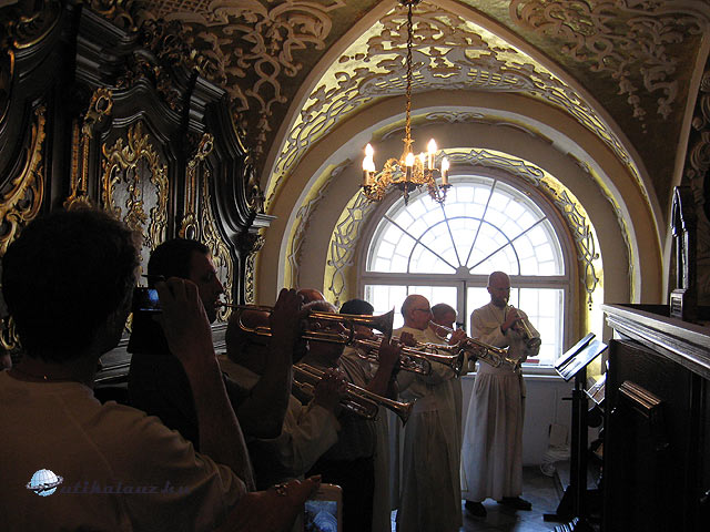 A mi kísérő atyánk is beállt a kürtösök közé. Ezután tovább mentünk a galérián, ahol Dudy Gracz modern festő vallási témájú festményei láthatók. Egy nagy faliképen azt az eseményt ábrázolja, amikor Kazimir király felajánlja a koronát Szűz Máriának.