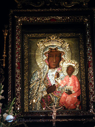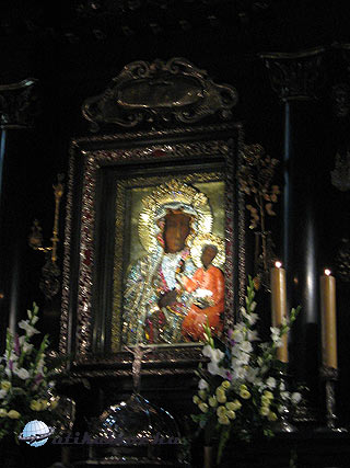 Pontban 12 órakor egy apáca zeneszóra nyitotta ki az addig becsukott szárnyakat. A fényképezésért fizetni kellett a szigorú őrnek, 5 zl-ért, kitűző matricát adott. A szentély előtti oldalfal is gyönyörű, aranyozott berakású képek díszítik. A bazilikából kijövetel után a téren álló Posztócsarnokot néztük meg kívül-belül.