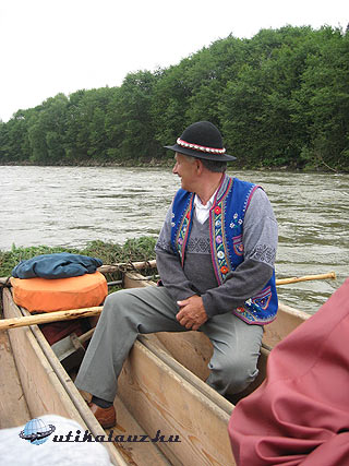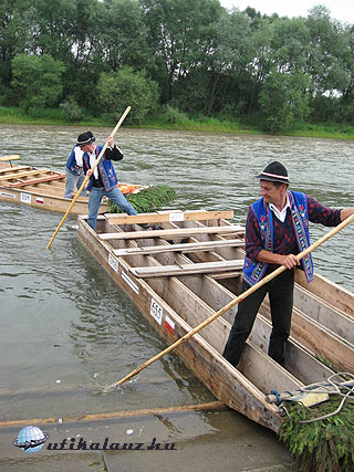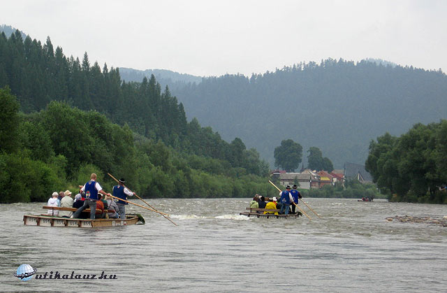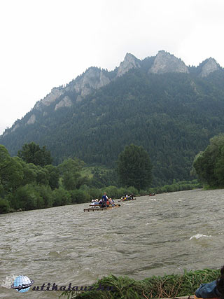 A félórás látogatás után indultunk tovább a dunajeci tutajozás színhelyére. Az indulási helyen gurál népviseletbe öltözött tutajosok szolgálták ki a turistákat. 12 személyes, 5 csónak összekötésével képzett tutajokon indult egy-egy egység a kanyargós folyón a 2 órás útra. A tutajosok a sekély vízben hosszú rudakkal irányították a folyás irányába az alkotmányt, mi 3 sorban ültünk padokon. Időnként a szélsőkre átcsaptak a hullámok (én is kaptam belőle). A Dunajec ezen a szakaszon hatszor változtat irányt, kanyarog a sziklák között. Menet közben viccelődött a gurál tutajos, mi pedig  népdalokat énekeltünk és fényképeztük a társakat, az elől és a hátul haladókat, de a mi egységünkről is készítettek képeket. A tutajozás végállomása Smorowce Wysne volt. A határfolyó egy kisebb szakaszán a szlovák oldalon is indítottak tutajokat.