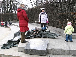 Itt újra meg kellett kérdezni merre induljunk el, mutogattam a fotót, a taxisok pedig próbálták kiolvasni a kép mellett a magyar szöveget, láthatóan nagyon tetszett nekik, ezzel jól szórakoztak, már gondolkoztam is, hogy neki ajándékozom a leiratot, had játszanak vele. A megállótól kb. 8 perc sétára volt a Lavra kolostor. Útközben Szaljut hotel, Belvedere klub mellett haladtunk el és értünk ki a Dnyeper partja mellé, ahonnan nagyon szép kilátás volt a folyóra és túloldalára. Innen is jól látszott, hogy főleg új toronyházak vannak, hatalmas lakóparkok. A Belvedere klub után a háborúban elhunyt hősök tiszteletére épített tér egy hatalmas beton obeliszkkel, ami az örök dicsfényüket jelképezi, síremlékekkel és sétánnyal. Az egyik koszorún hatalmas bronz masnit a pici gyerekek csúszdaként használták. Rengeteg anyuka tologatta itt a babakocsikat, és sétálgattak játszottak a picikkel.