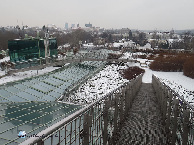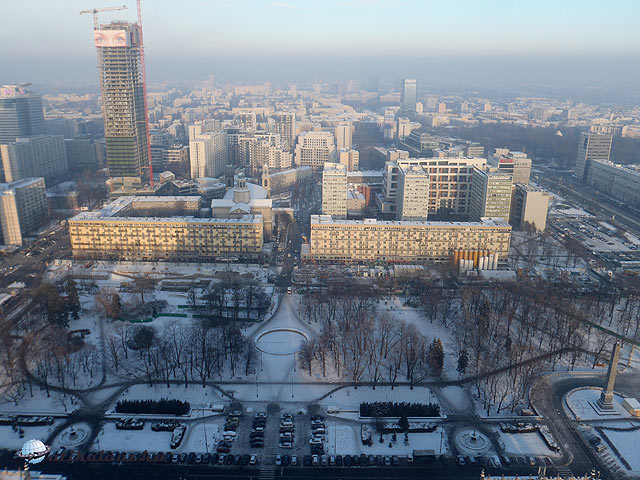 Másnap korán reggel indultunk neki a városnak, mivel tél lévén a nap nagyon korán megy le. 8 órakor még inkább szürkület volt, mint nappali fény. Ez 9-10 órára javult, amikor kisütött a nap. Először megint a Kultúrpalota felé vettük az irányt, mivel ki akartuk használni a tiszta időt panorámaképek készítésére. Az épület aljában van egy Tourist Office, ahol várostérképet és különböző igen hasznos tematikus prospektusokat szerezhetünk. A panorámaterasz a 30. emeleten található. Összesen két lift visz fel, ezeket külön emberek irányítják. Rajtunk kívül senki nem volt az emeleten, a kilátás pedig feledhető. Nem tudom, hogy nyáron milyen, de télen mindent elfed a hó, így még jó idő esetén sem sokat láttunk. A belépő 15 PLN.