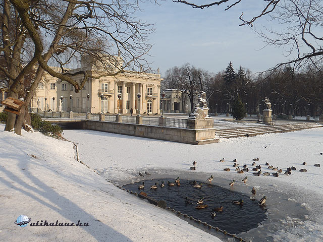 Ezután a Lazienski parkba indultunk. Ez a Királyi út kezdete, ami innen egészen az Óvárosig vezet. A Lazienski Park egy fürdőpark sok kisebb épülettel. A belépés ingyenes. Érdemes a sétát a Belvedere-vel kezdeni, ahol a lengyel elnök lakik. Innen tavak és kápolnák mellett elhaladva figyelhetjük meg a park népes élővilágát, ami mókusokból, vadkacsákból, galambokból és különböző vadmadarakból áll. A mókusok olyan szelídek, hogy kézből lehet őket etetni. A park leglátványosabb épülete a Tóra épült palota, amely előtt őr vigyázott a didergő pávákra. Nyáron a tóban csónakázni is lehet, most viszont teljesen befagyott.  A fürdőpalota mellett található a római mintára épült amfiteátrum. A városközpont felé indulva egy emelkedő tetején megpillanthatjuk az Ujazdów-i várat, amelyben található a Kortárs Művészetek Központja. A vár elég lepusztult állapotban volt, több helyen felállványozva.