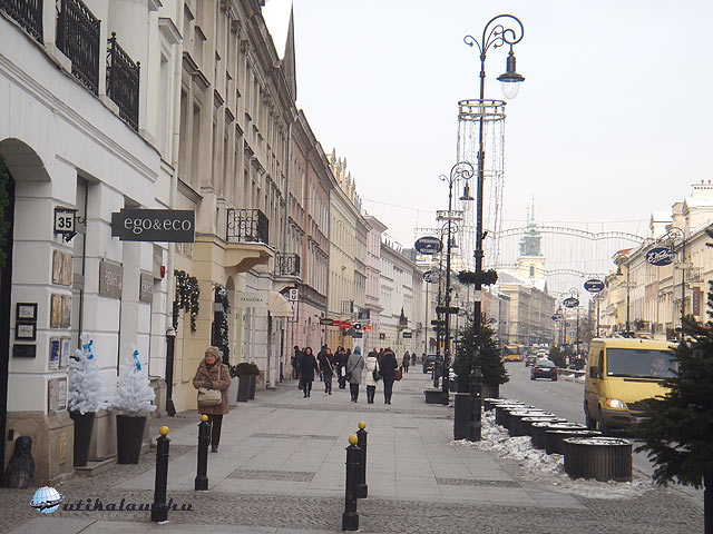 A Lazienski parkból kiérve egy széles sugárúton találjuk magunkat, ahol a szépen felújított épületben főleg nagykövetségek működnek. Leginkább az Andrássy út Hősök tere és Oktogon közötti szakaszára tudnám hasonlítani. Egy forgalmas csomópontba érve megcsodálhatjuk a mű pálmafát, míg végül elérjük a klasszikus értelemben vett sétálóutcát. Ide már nem lehet behajtani minden személygépkocsival, így ez a környék jóval csendesebb. Főleg éttermek és boltok találhatóak itt, de közel sem annyi, mint mondjuk a Váci utcában. Az utcán végighaladva megcsodálhatjuk a Varsó Egyetem épületeit, a Szent Kereszt templomot ahol Frédéric Chopin szívét őrzik, az Elnöki Palotát, és még további néhány szép épületet.