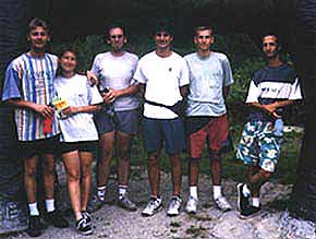 Az első éjszakát a Bécstől 10 km-re lévő klosterneuburgi kempingben töltöttük. A dolog jól indult mert a recepciós srác nagyon jól beszélt magyarul, mert mint kiderült az édesanyja magyar származású. Árakról csak annyit, hogy nagyon kedvezően megúsztuk. Az első probléma itt jött elő. Az egyik (3 személyes) sátor felállításánál derült ki, hogy májusban amikor utoljára használták nem szárították ki és így rakták el. Gondolhatod milyen meglepetés ért amikor a sátrat fel akartuk állítani. Másnap reggel fél 10-kor indultunk a klosterneuburgi pu.-ról Passauba. Mivel 6-an voltunk ezért a csoportos kedvezményt igénybe vehettük így személyenként 283 ATS jött ki kerékpárral együtt. A hosszadalmas vonatozás után Passauban útmutatásod alapján könnyen megtaláltuk az Ilz folyó torkolatánál lévő kempinget. A tulaj 9 DM-et kért személyenként de schillinget is elfogadott (7-tel szorozva). Másnap némi városnézés után indultunk útnak. A bal parton haladva 16 kilométerre Passautól mi is megtaláltuk a Penny Market-et ahol a megmaradt márkáinkat elkölthettük. A wessenuferi hídon mentünk át a jobb partra. Mi is vágytunk már egy kis romantikára, ezért a schlögeni kemping helyett az inzelit választottuk. A kemping mellett működő vendéglő tulajdonosa aki egyben a kempinget is felügyelte szívélyesen fogadott bennünket és még néhány szót magyarul is tudott. Egy éjszakára 70 ATS-t kért fejenként. Itt a zuhanyzás benne volt az árban, de az étel melegítési lehetőség hiányzott. Egész éjszaka zuhogott az eső és a szomszédban bőgtek a tehenek. (Nekem más elképzeléseim voltak a romantikáról.)