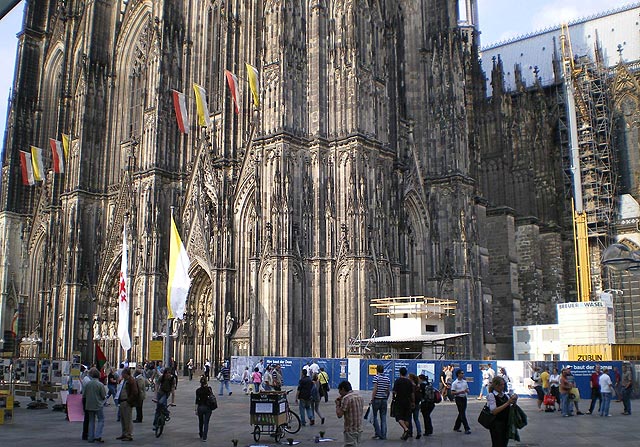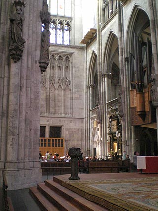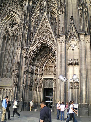 Koblenztől (az A61-es autópályán elindulva) mintegy 100 kilométerre fekszik Németország negyedik legnagyobb városa Köln. A Rajna két partján fekvő város sok régi és modern épületéről nevezetes, de mind között a dóm a legismertebb. Méreteivel, többek között tornyai 157 méteres magasságával a szó szoros értelmében kimagaslik az ország egyházi építményei közül. Nagy méretei és feltűnő elhelyezkedése ellenére a háború során szerencsére nem szenvedett különösebb sérüléseket. Mivel a főpályaudvar és a Rajna-part közelében van, nemcsak a gyalogosan, a belváros felől érkezők érhetik el könnyen, hanem vonaton vagy vízi járműveken utazók is. Már a szépen kialakított, oroszlános kopogtatóval ellátott gótikus bejáratnál is kicsinek érzi magát az ember. (Az összhatást egy kicsit lerontja a belső, huszadik századi ajtó.) Ez az érzés csak fokozódott, mikor megláttuk a hatalmas belső teret. Hasonló lenyűgöző hatást tett ránk az, amikor néhány évvel ezelőtt a kölni dómnál nagyobb római Szent Péter Bazilikába léptünk be. A méreteket a kétdimenziós képek nem tudják úgy érzékeltetni, mint amilyenek azok valójában.