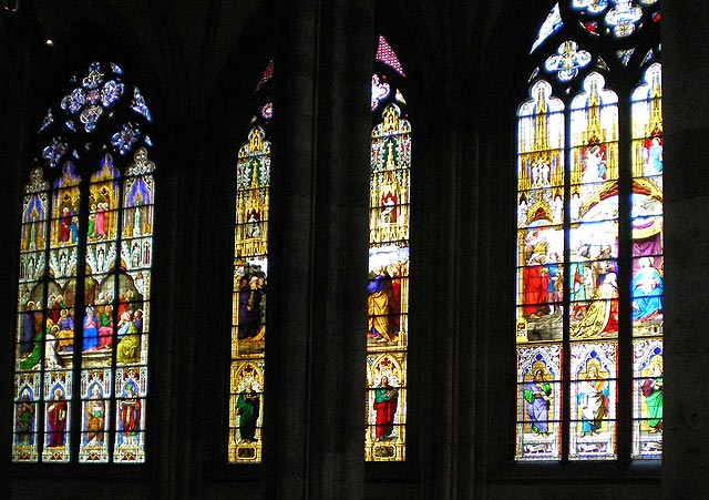 A dóm ablakainak nagy része sokszáz évvel ezelőtt készült festett üvegből, melyeknek különféle neveket adtak (pl. Pünkösd-ablak, vagy Háromkirályok-ablak). A két nagy tornyon kívül számtalan, szintén a gótika jegyeit tükröző kis torony díszíti az épületet. A művészek a gótikára jellemző módon a legapróbb részletekig kidolgozták mind a figurákat, mind az egyéb díszeket.