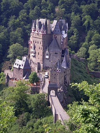 A Mosel vidékén látható 18 régi vár és kastély talán nem annyira ismert, mint a rajna-völgyi 24, de szép és érdekes helyeket itt is bőven találhatunk. Ezek közül is kiemelkedik Eltz vára (Burg Eltz). A várat a IX. században kezdték építeni egy szikla tetejére az Elzbach-patak völgyében. A szikla tetejére épített várról azt gondolná az ember, hogy a hasonló nevezetességeknél megszokott módon, egy magaslaton van. Nagy meglepetés ért minket, amikor azt láttuk, hogy ez a vár egy völgyben van, úgy is lehet mondani, hogy jól eldugva. Mind a Mosel-parti B416. sz. útról, mind a Trier és Koblenz közötti A48-as autópálya felől több lejáratnál is jól látható táblák jelzik, hol kell a vár felé letérni. Mindkét irányból Münstermaifeld község érintésével juthatunk el a vár parkolójáig. Innen párszáz méteres séta után érjük el a vár bejáratát. Már menetközben elénk tárult a völgyben álló vár, melyet körbefog a kis patak. A vár elsősorban földrajzi elhelyezkedése, rejtettsége miatt gyakorlatilag megúszta az elmúlt századok máshol jobban érvényesülő rombolásait. Ennek következtében eredeti épségükben és szépségükben megmaradtak a különféle korok építészeti emlékei, mindennapi használati és berendezési tárgyai. A belépődíj felnőtteknek 8 €, gyerekeknek 5,5 €. Csoportos látogatásnál kedvezmények. További információkhoz angol és német nyelven a www.burg-eltz.de oldalon juthatunk.