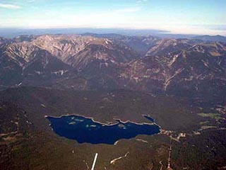 Garmisch-Partenkirchen házai, valamint az Eibsee és környéke.