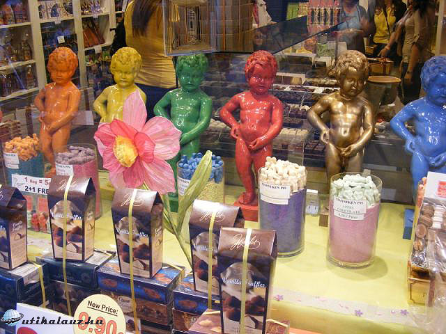 A csokik drágák, és – kövezzen meg bárki – annyira nem jók, szerintem, mint amilyen drágák. Egy euróért osztogatnak kis Manneken Piseket a szivárvány minden színében. Ezeket sok helyen fel is darabolják és lehet kóstolgatni.