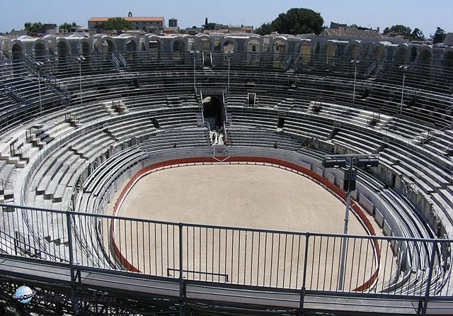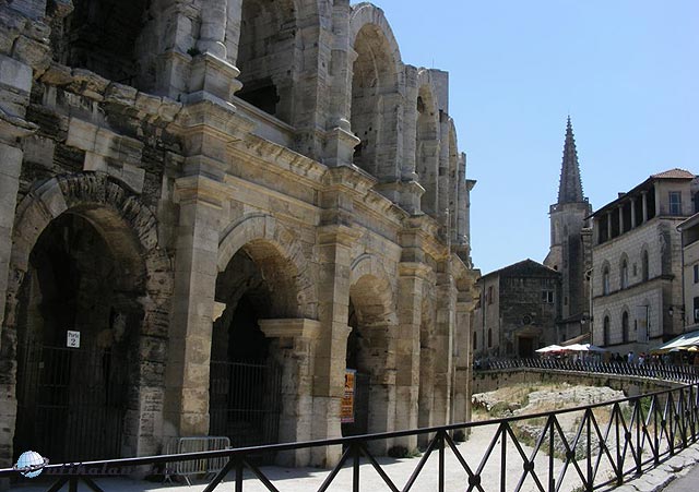 A Rhone-folyó túlpartján sikerült megállnunk ingyen, onnan nem kellett olyan vészesen sokat gyalogolnunk befelé. A Bld. Clemanceau-n (igen, ő…) van a Tourinform, onnan lehet szerezni térképet. Amúgy a kempingekben vagy tourinformokban szerezhető térképekkel és tájékoztatóval meg esetleg egy itthoni útikönyvvel el lehet boldogulni bárhol. Van egy nagyon épen megmaradt arénájuk, annyira, hogy bikaviadalokat is szoktak benne rendezni (nagyon érződik a spanyol határ közelsége). Érdemes bemenni, sőt felmenni a toronyba, nagyon szép a kilátás.