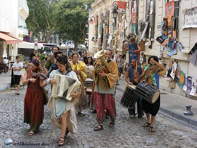Akik éppen nem adnak elő, azok szórólapokkal invitálnak mindenkit az előadásukra. Hatalmas, színes forgatag, minden társulat valami extrém módon (ruhával és/vagy viselkedéssel) próbálja felhívni magára a figyelmet. Kár lett volna nem a fesztivál idején Avignonba látogatni… 10/10 pont